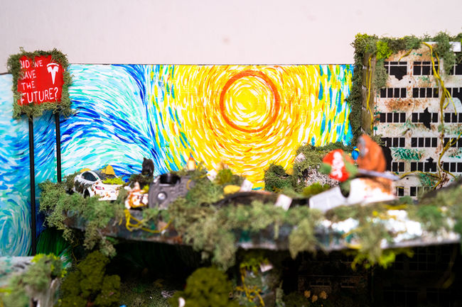 Post Humanity is a sculpture capturing the aftermath of humanity being wiped out due to global warming and environmental neglect. Depicting a post-apocalyptic scene, inspired by the movie Leave the World Behind, the sculpture portrays collapsed buildings, concave roads, and abandoned cars overtaken by vegetation and animals.